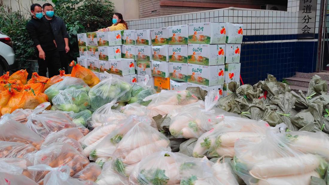 在重庆市铜梁区东城街道龙腾盛世小区,三辆满载物资、从巫山远道而来的物资配送车停在了大门外,等候在此的社区和物业工作人员将萝卜、白菜、土豆、红薯等蔬菜搬运下来。
