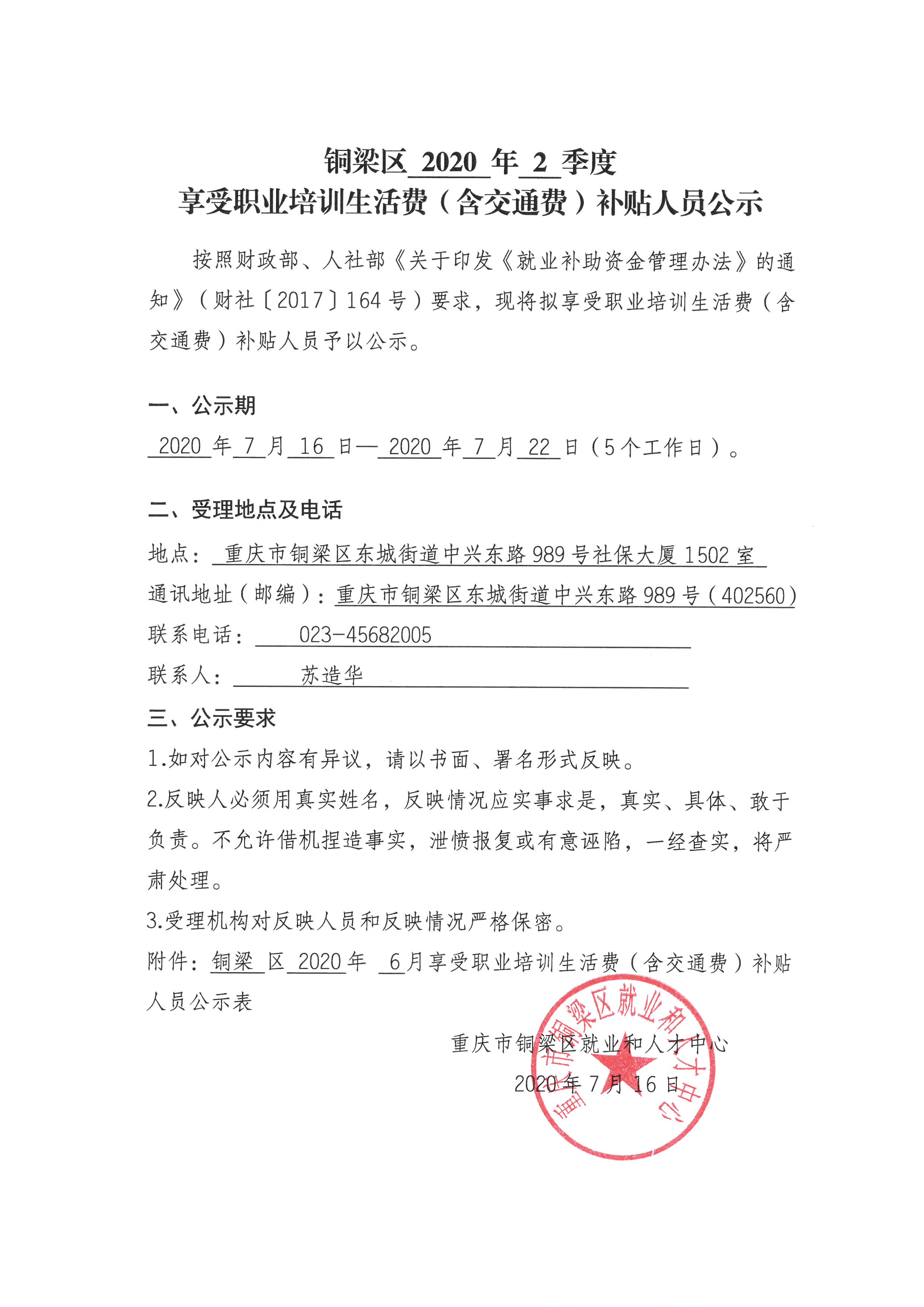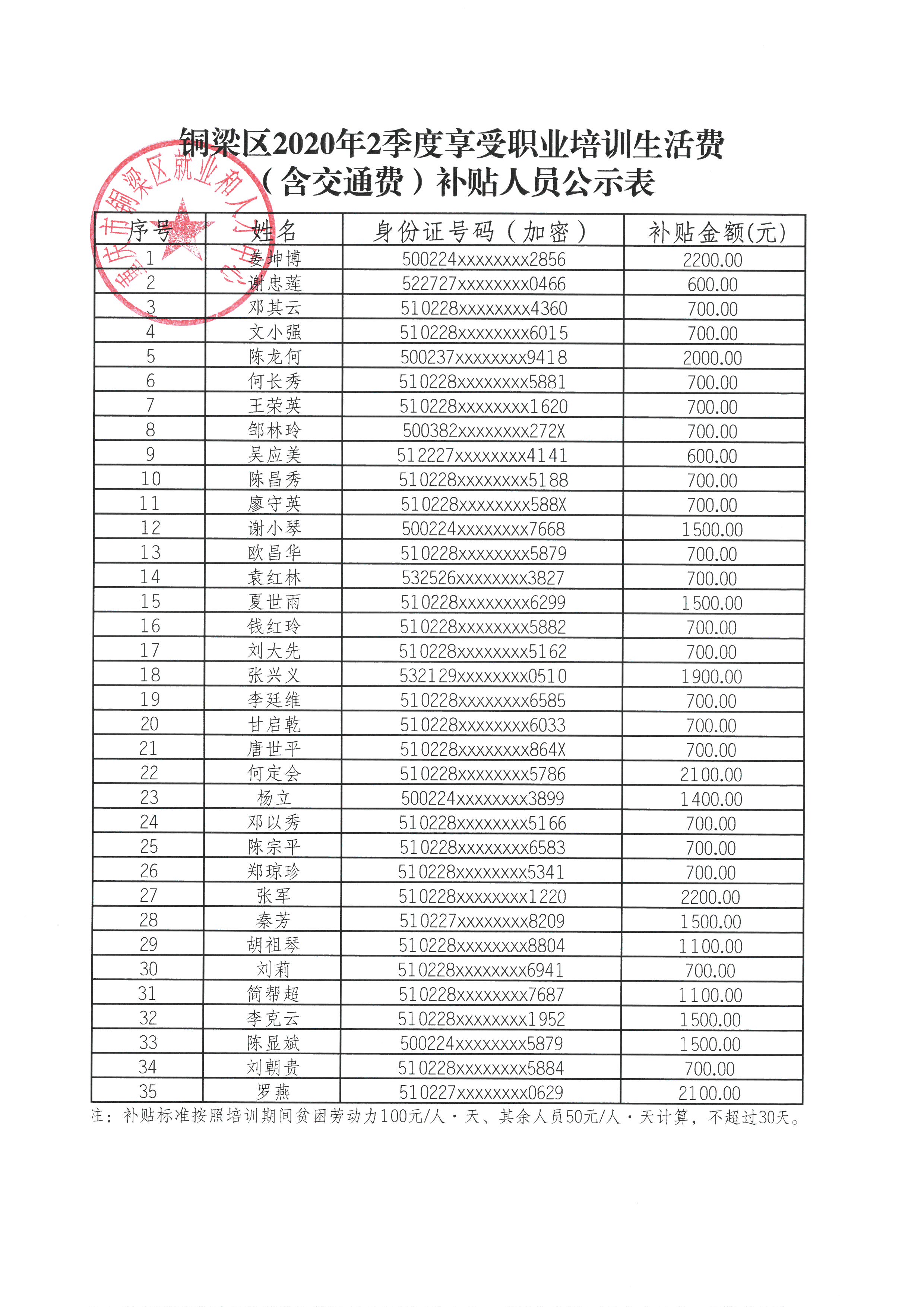 铜梁区2020年2季度享受职业培训生活费(含交通费)补贴人员公示
