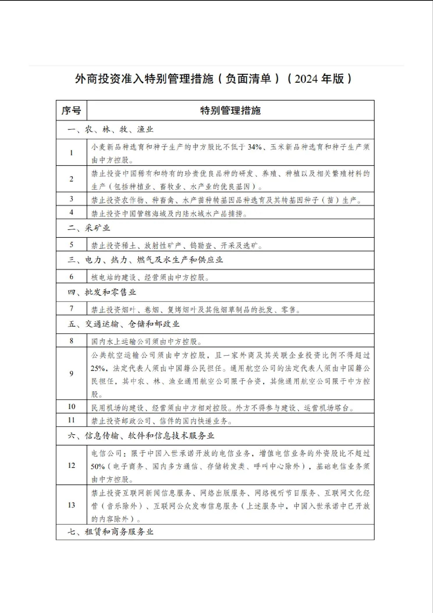 外商投资准入特别管理措施(负面清单)(2024年版)