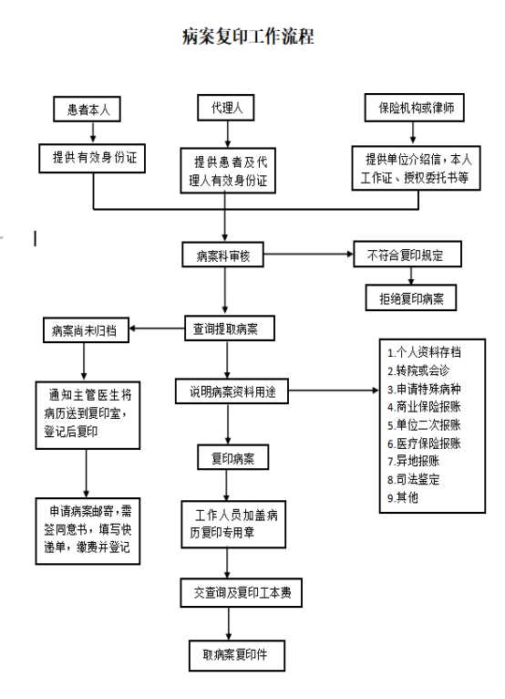 (一)病案管理科有专人负责受理复印或者复制病历资料的申请。受理申请时,申请人应提供下列有关证明材料,并对申请材料的形式进行审核:
