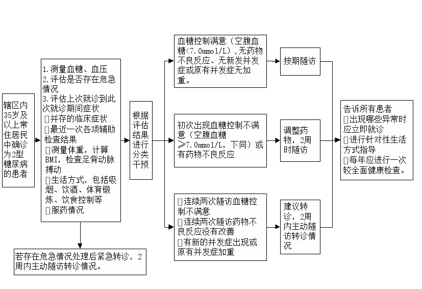 (1)测量空腹血糖和血压,并评估是否存在危急情况,如出现血糖≥16.7mmol/L或血糖≤3.9mmol/L;收缩压≥180mmHg和/或舒张压≥110mmHg;意识或行为改变、呼气有烂苹果样丙酮味、心悸、出汗、食欲减退、恶心、呕吐、多饮、多尿、腹痛、有深大呼吸、皮肤潮红;持续性心动过速(心率超过100次/分钟);体温超过39摄氏度或有其他的突发异常情况,如视力突然骤降、妊娠期及哺乳期血糖高于正常值等危险情况之一,或存在不能处理的其他疾病时,须在处理后紧急转诊。对于紧急转诊者,乡镇卫生院、村卫生室、社区卫生服务中心(站)应在2周内主动随访转诊情况。