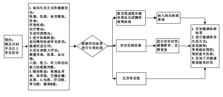 每年为老年人提供1次健康管理服务,包括生活方式和健康状况评估、体格检查、辅助检查和健康指导。
