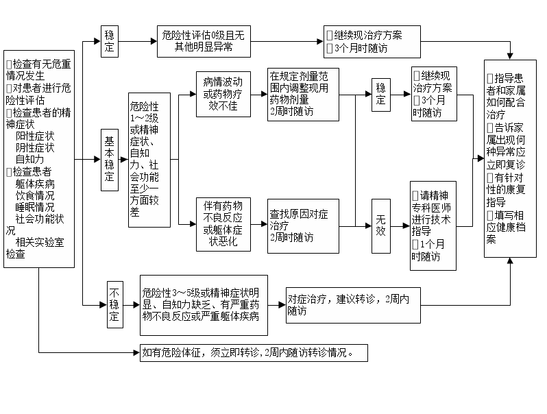 3.病情稳定患者。若危险性为0级,且精神症状基本消失,自知力基本恢复,社会功能处于一般或良好,无严重药物不良反应,躯体疾病稳定,无其他异常,继续执行上级医院制定的治疗方案,3个月时随访。