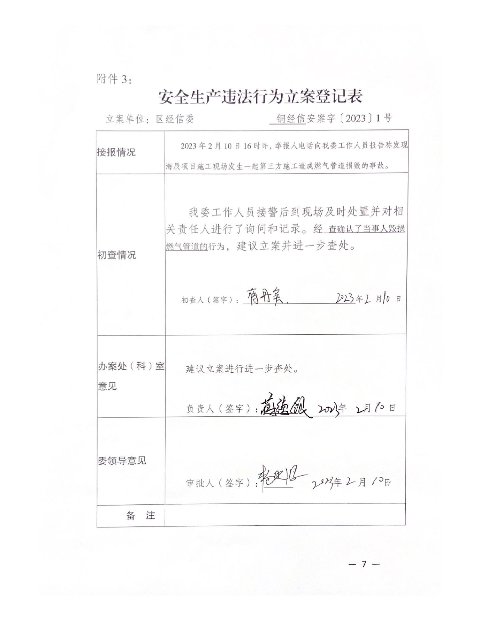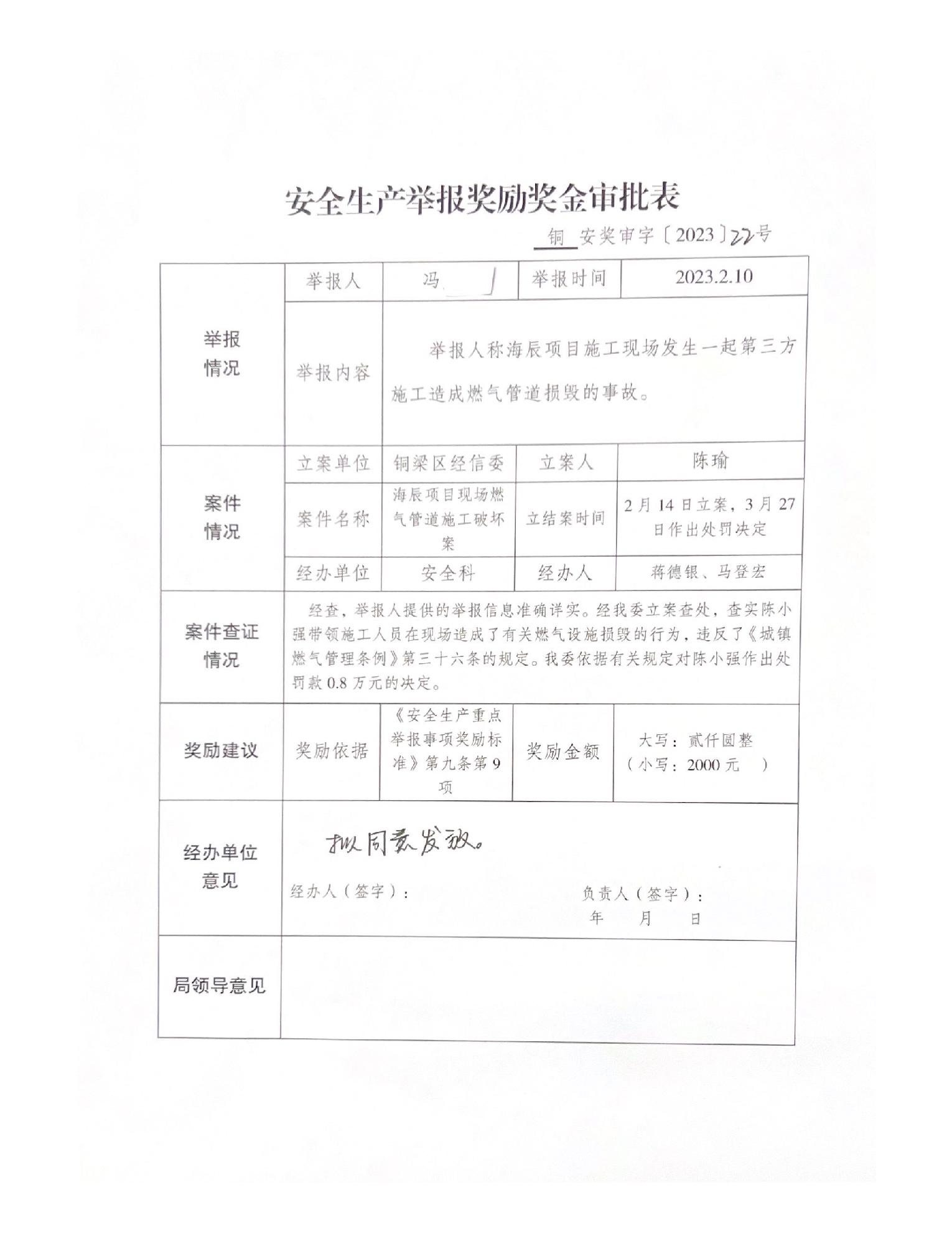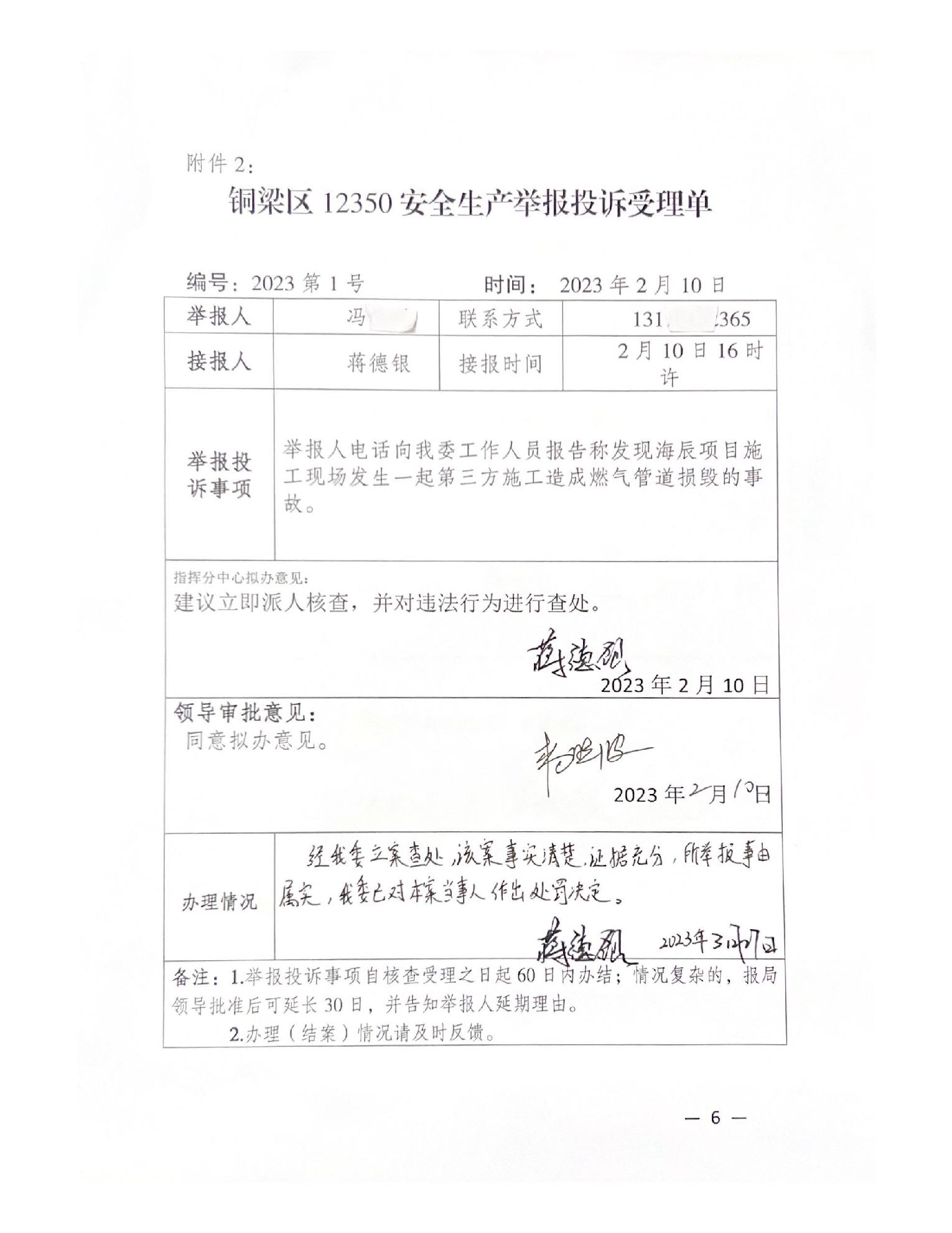铜梁区12350 安全生产举报投诉受理单2023第1号