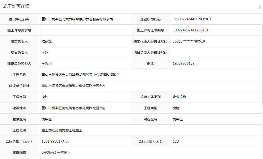 重庆市铜梁区光大百龄帮龙都颐养中心装修改造项目施工许可