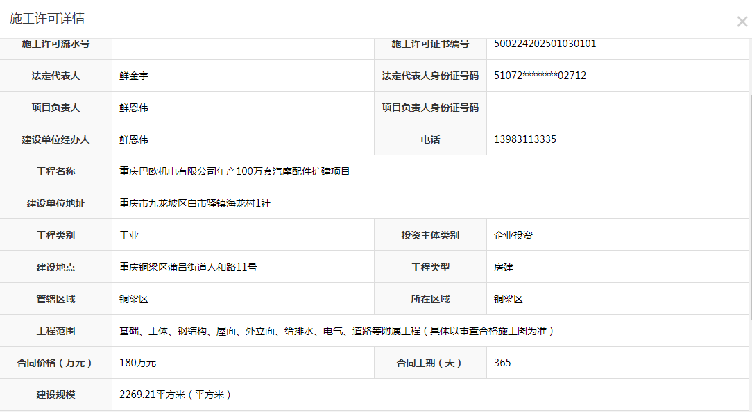 重庆巴欧机电有限公司年产100万套汽摩配件扩建项目施工许可