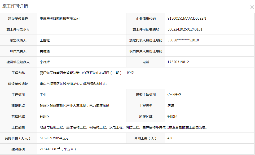 厦门海辰储能西南智能制造中心及研发中心项目(一期)-二阶段施工许可