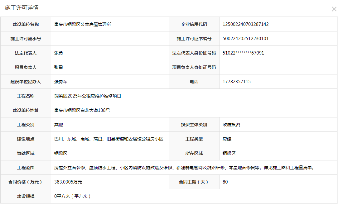 铜梁区2025年公租房维护维修项目施工许可