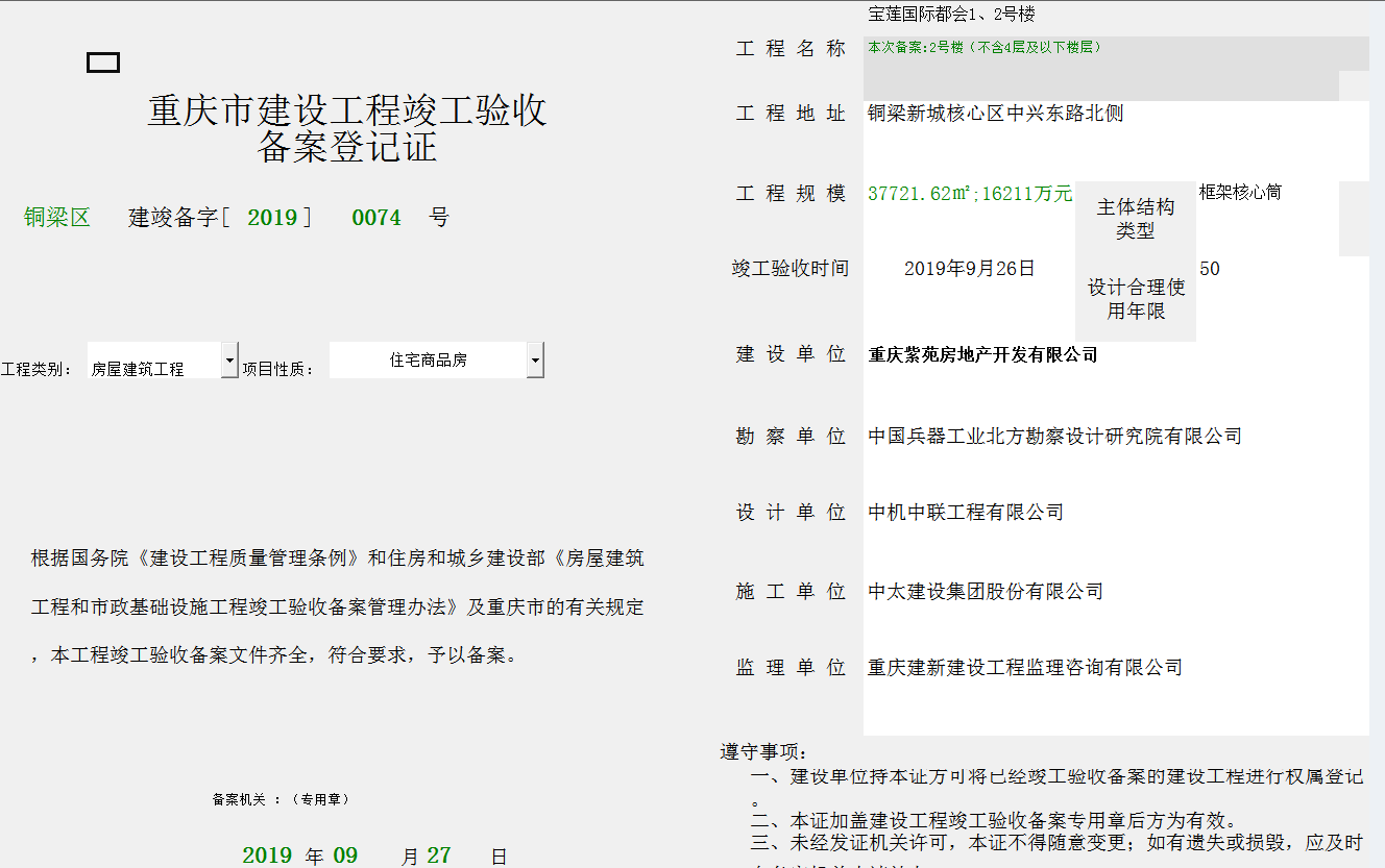 宝莲国际2号楼(不含4层及以下楼层)竣工验收备案登记证