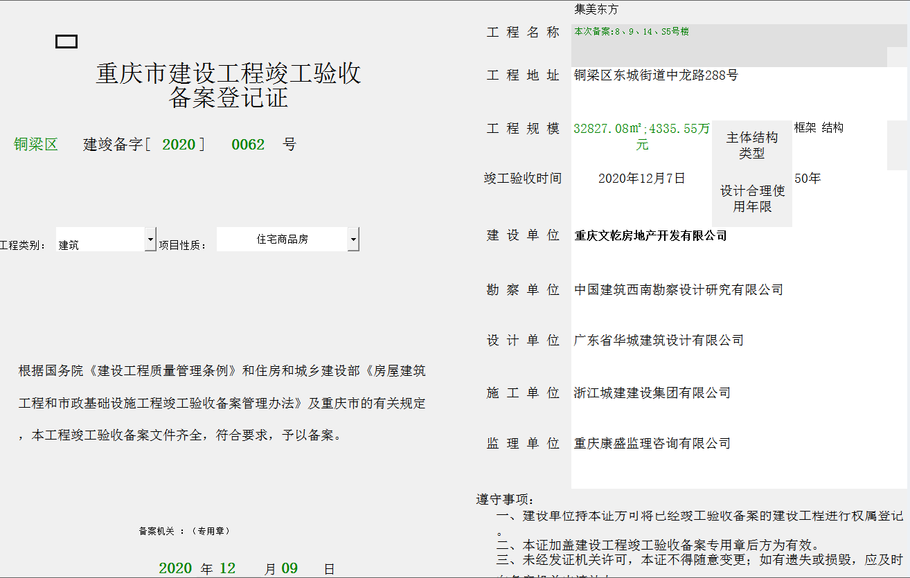 集美东方8、9、14、S5号楼竣工验收备案登记证