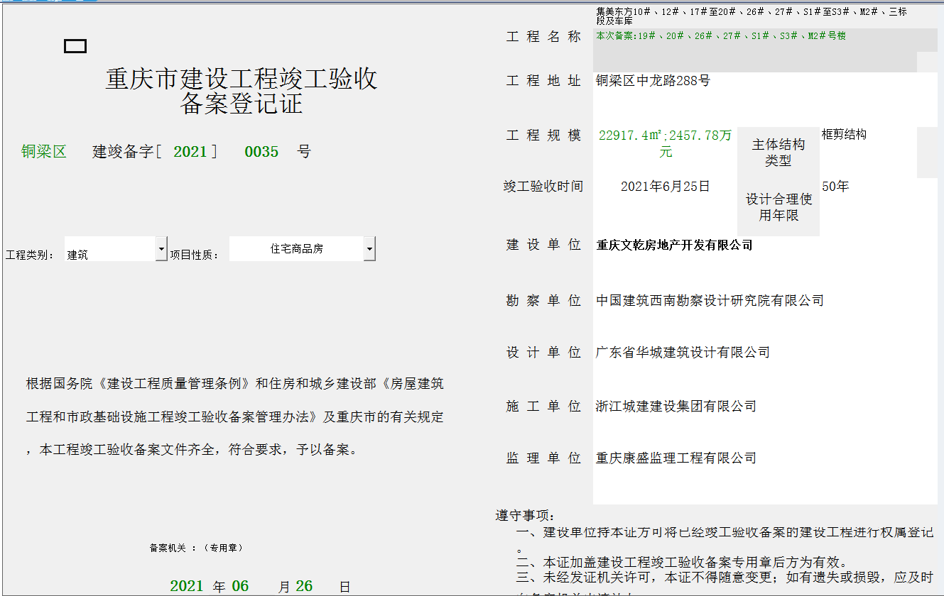 集美东方19#、20#、26#、27#、S1#、S3#、M2#号楼工验收备案登记证