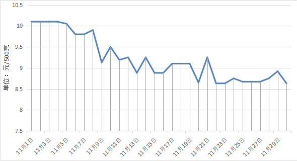从监测数据来看,猪肉月均价为18.17元/500克,环比下跌2.21%。生猪价格小幅下跌,从11月1日10.10元/500克波动跌至11月30日8.63元/500克。主要原因是:养殖场出栏积极性较高,散户前期二次育肥的大猪集中出栏,供应端明显增量,下游市场消化有限,供多需少带动猪价下跌。后市来看,随着腌腊活动增多,下游需求有所提振,猪价将止跌回稳。