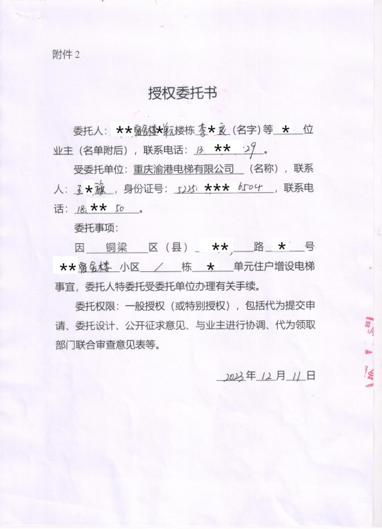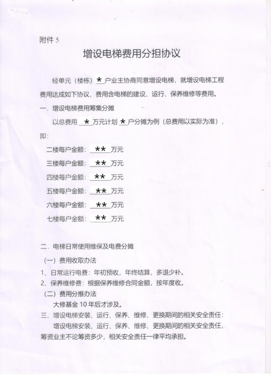 附件:1.书面申请;2.授权委托书;3.增设电梯示意图;4.业主书面同意意见。5.增设电梯协议书。