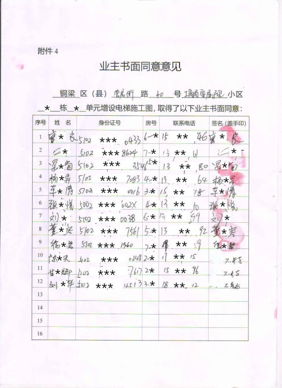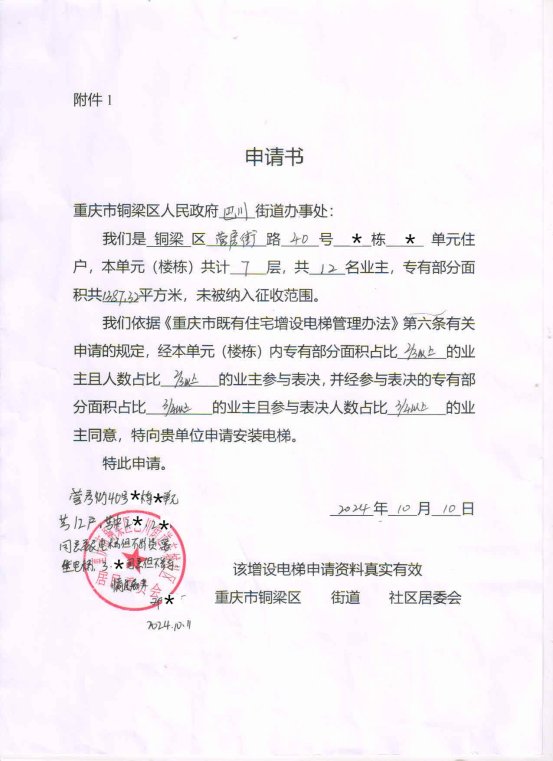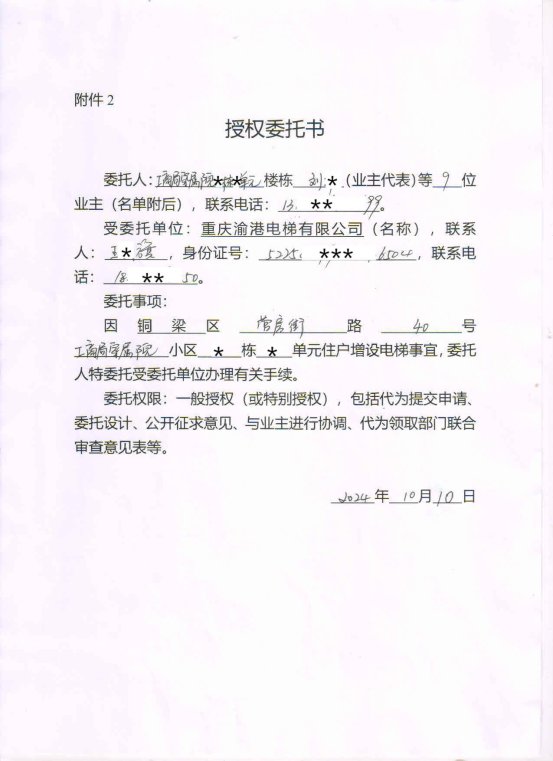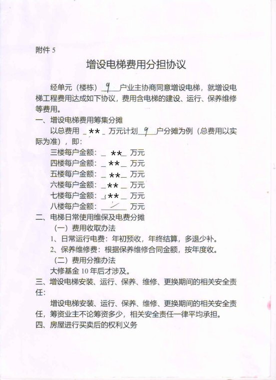 附件:1.书面申请;2.授权委托书;3.增设电梯示意图;4.业主书面同意意见;5.增设电梯协议书。