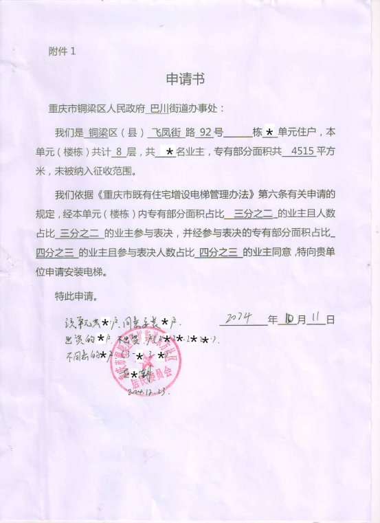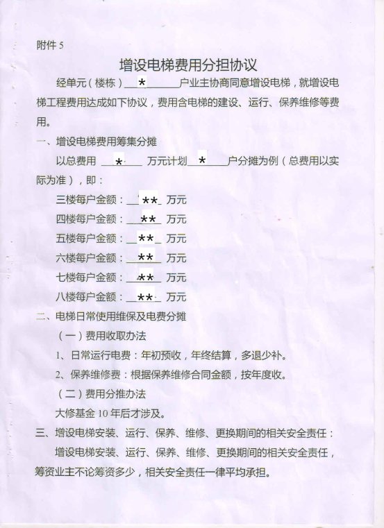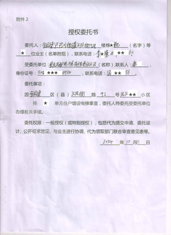 附件:1.书面申请;2.授权委托书;3.增设电梯示意图;4.业主书面同意意见;5.增设电梯协议书。