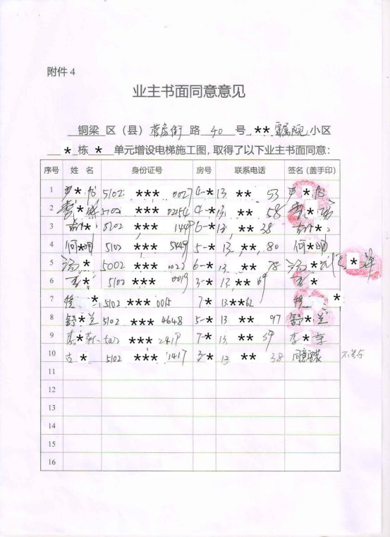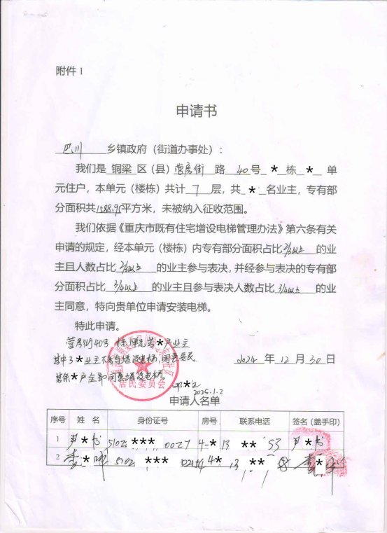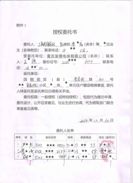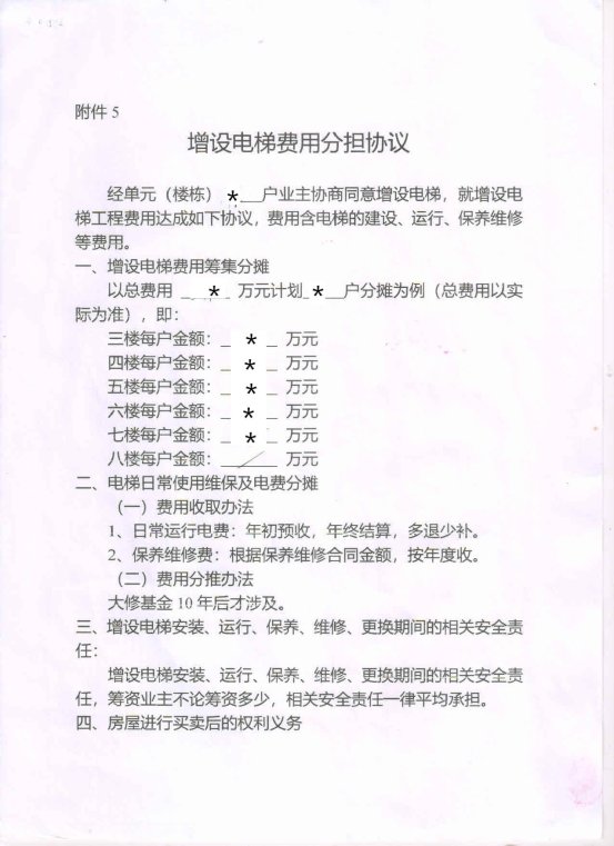 附件:1.书面申请;2.授权委托书;3.增设电梯示意图;4.业主书面同意意见;5.增设电梯协议书。