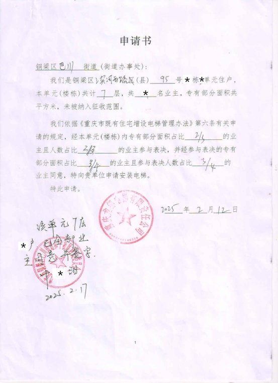 近日,铜梁区巴川街道滨河西路95号(阳*水岸)16栋*单元彭*琼等12位业主向重庆市铜梁区巴川街道办事处提出申请,增设电梯。铜梁区巴川街道滨河西路95号(阳*水岸)16栋*单元增设电梯项目的相关情况公示如下:
