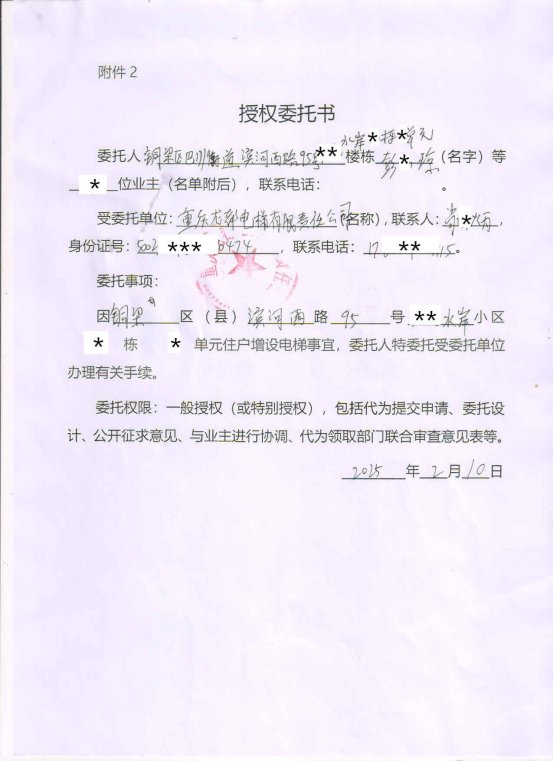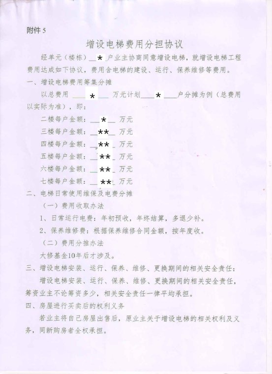 附件:1.书面申请;2.授权委托书;3.增设电梯示意图;4.业主书面同意意见;5.增设电梯协议书。