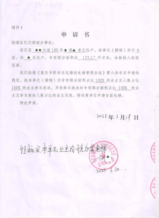 近日,铜梁区巴川街道龙城大道185号*栋*单元安*权等12位业主向重庆市铜梁区巴川街道办事处提出申请,增设电梯。铜梁区巴川街道龙城大道185号*栋*单元增设电梯项目的相关情况公示如下: