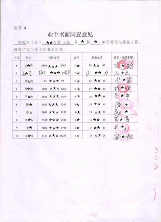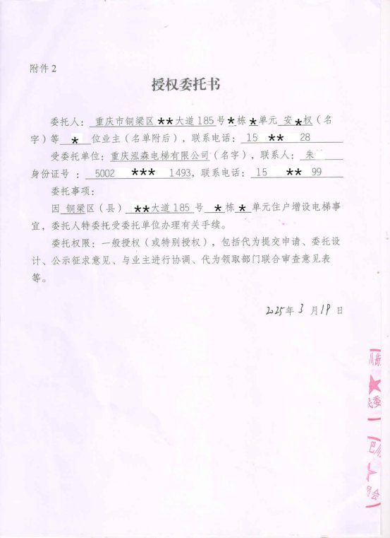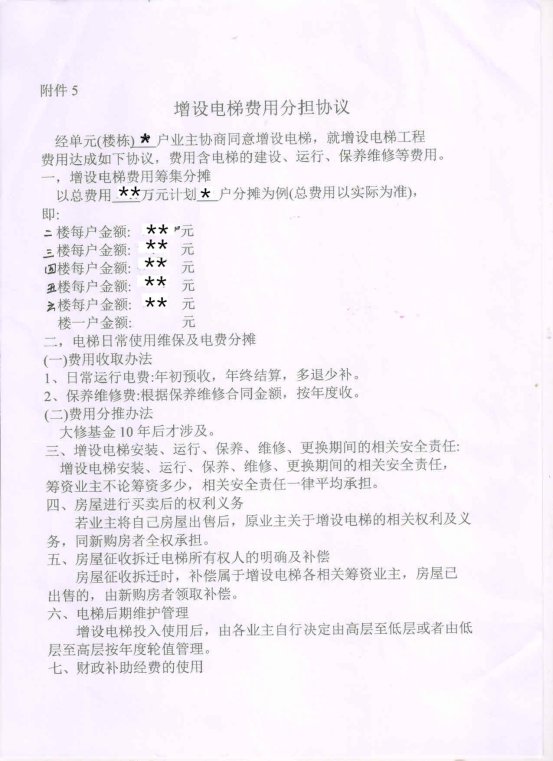 附件:1.书面申请;2.授权委托书;3.增设电梯示意图;4.业主书面同意意见;5.增设电梯协议书。