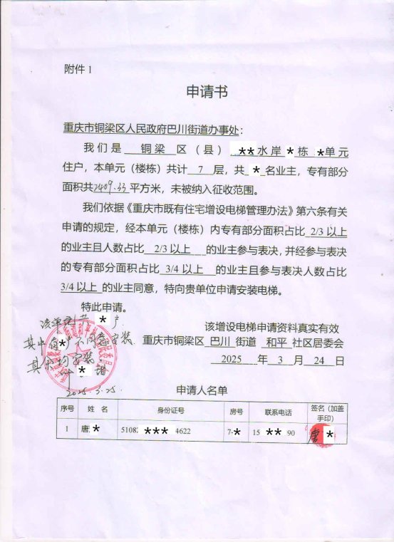 重庆市铜梁区巴川街道根据《重庆市既有住宅增设电梯建设管理办法》规定,现将书面申请、增设电梯示意图、经核实并盖章后的同意增设电梯的业主名单及书面同意意见等申请内容向相关业主和利害关系人进行公示,公开征询意见。公示期为7日,2025年5月15日——2025年5月21日。同时在铜梁区政府网同步进行公示,公示链接:https://www.cqstl.gov.cn/。
