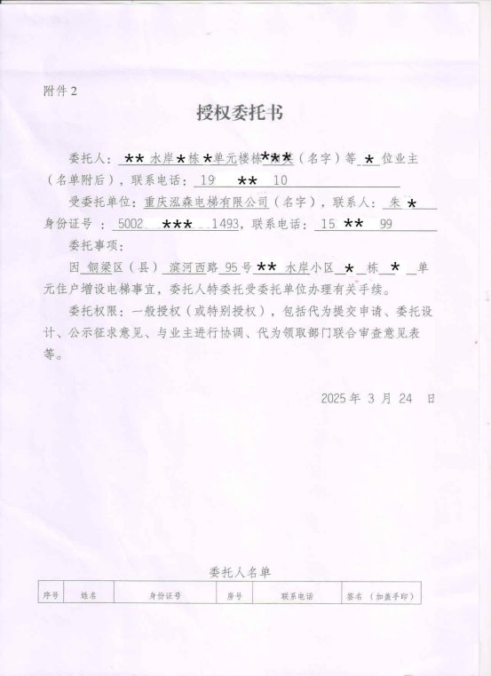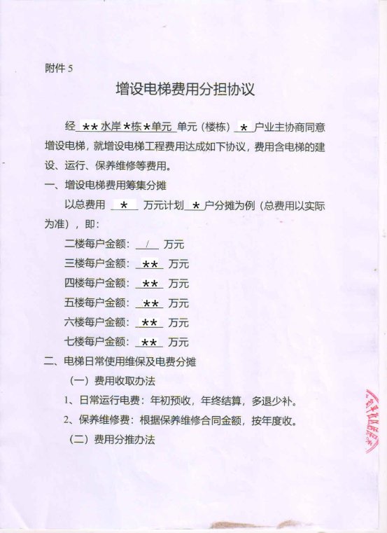 附件:1.书面申请;2.授权委托书;3.增设电梯示意图;4.业主书面同意意见;5.增设电梯协议书。