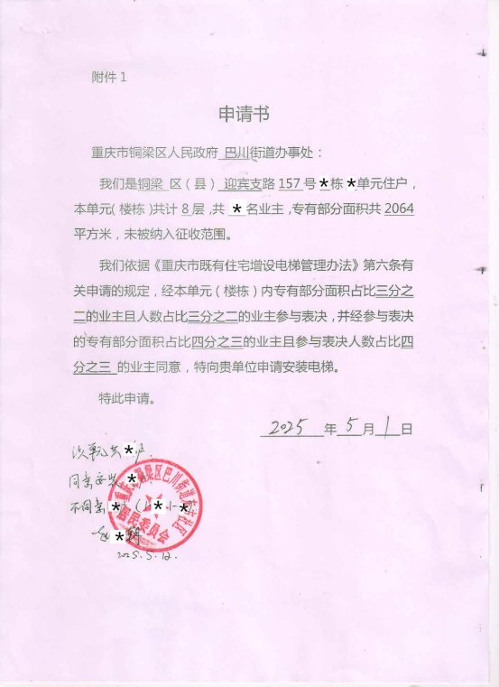 重庆市铜梁区巴川街道办事处根据《重庆市既有住宅增设电梯建设管理办法》规定,现将书面申请、增设电梯示意图、经核实并盖章后的同意增设电梯的业主名单及书面同意意见等申请内容向相关业主和利害关系人进行公示,公开征询意见。公示期为7日,2025年6月20日——2025年6月26日。同时在铜梁区政府网同步进行公示,公示链接:https://www.cqstl.gov.cn/。