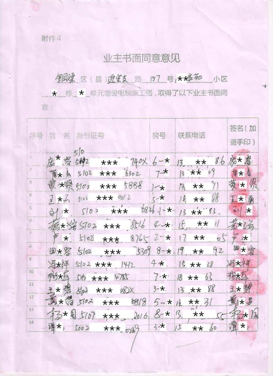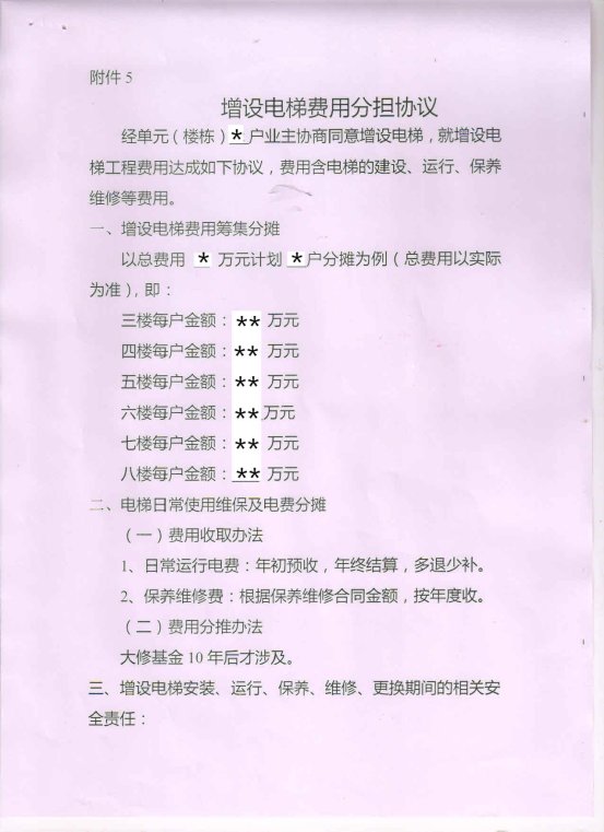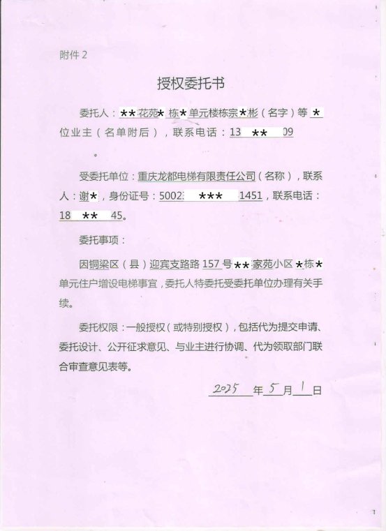 附件:1.书面申请;2.授权委托书;3.增设电梯示意图;4.业主书面同意意见;5.增设电梯协议书。