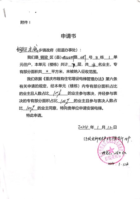 附件:1.现场照片;2.申请书及名单;3.授权委托书及名单;4.业主书面同意意见。5.费用分担协议及名单。