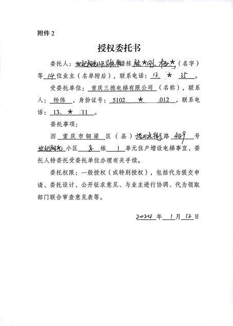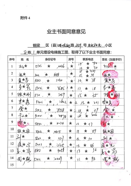 近日,铜梁区东城街道塔山东街*号(世纪阳光)*栋*单元共计14户业主,其中陈*刚、杨*静(业主代表姓名)等14户业主向重庆市铜梁区人民政府东城街道办事处提出申请,增设电梯。现将铜梁区世纪阳光*栋*单元增设电梯项目的相关情况公示如下: