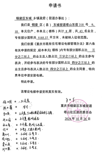 重庆市铜梁区人民政府东城街道办事处根据《重庆市既有住宅增设电梯管理办法》规定,现将书面申请、增设电梯示意图、经核实并盖章后的同意增设电梯的业主名单及书面同意意见等申请内容向相关业主和利害关系人进行公示,公开征询意见。公示期为7日,2025年1月8日——2025年1月14日。同时在铜梁区政府网同步进行公示,公示链接:https://www.cqstl.gov.cn/。