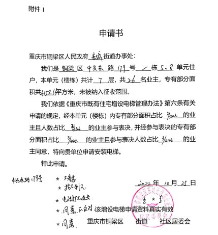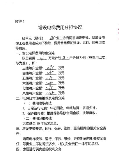 附件:1.书面申请;2.相关合格书;3.增设电梯示意图;4.业主书面同意意见。5.费用分担协议。