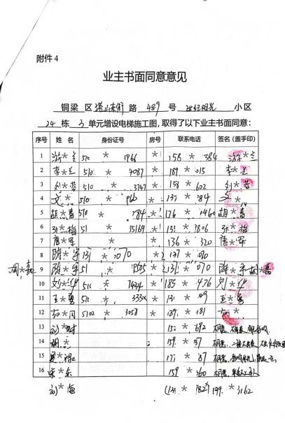 近日,铜梁区东城街道塔山东街*号(世纪阳光)*栋*单元共计16户业主,其中胡*春等11户业主向重庆市铜梁区人民政府东城街道办事处提出申请,增设电梯。现将铜梁区东城街道塔山东街*号(世纪阳光)*栋*单元增设电梯项目的相关情况公示如下: