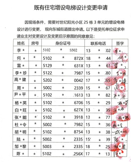近日,铜梁区东城街道塔山东街*号(世纪阳光)*栋*单元共计32户业主,其中李*等22户业主向重庆市铜梁区人民政府东城街道办事处提出申请,变更电梯设计。现将铜梁区东城街道塔山东街*号(世纪阳光)*栋*单元增设电梯项目的相关情况公示如下: