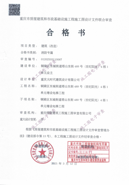 该增设电梯项目名称为铜梁区东城街道塔山东街*号(世纪阳光)*栋*单元增设电梯项目,建设单位为重庆渝港电梯有限公司,设计单位为重庆大时代建筑设计有限公司,建设地点位于铜梁区东城街道塔山东街*号(世纪阳光)*栋*单元(方案详见增设电梯示意图),属重庆市铜梁区东城街道长坡社区。