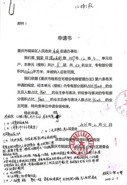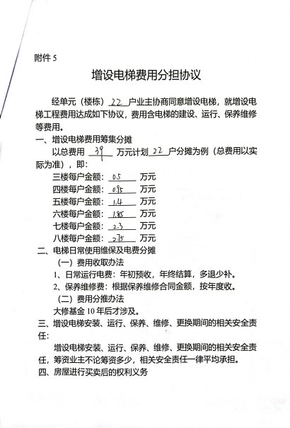 附件:1.书面申请;2.相关合格书;3.增设电梯示意图;4.业主书面同意意见。5.费用分担协议。