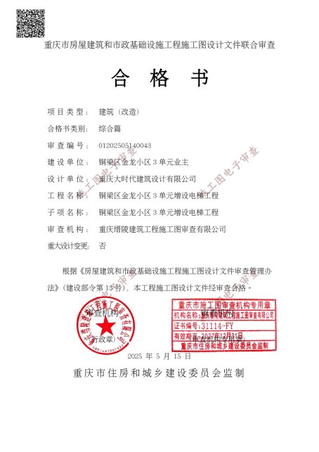 该增设电梯项目名称为铜梁区东城街道塔山东街*号(金龙小区)*单元增设电梯项目,建设单位为重庆龙都电梯有限责任公司,设计单位为重庆大时代建筑设计有限公司,建设地点位于铜梁区东城街道塔山东街*号(金龙小区)*单元(方案详见增设电梯示意图),属重庆市铜梁区东城街道塔山社区。