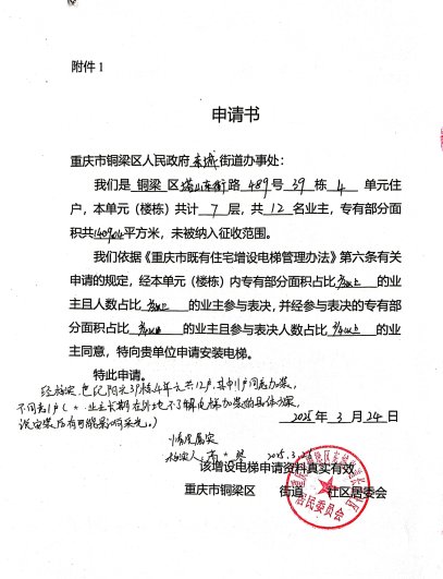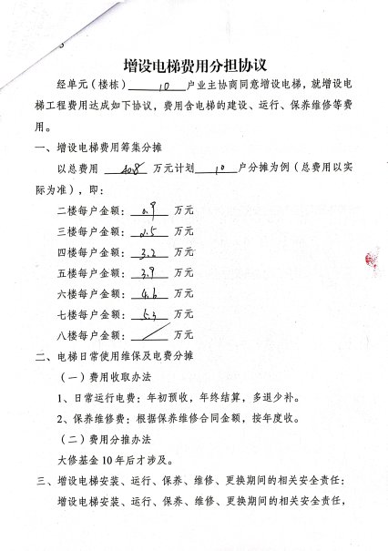 附件:1.书面申请;2.相关合格书;3.增设电梯示意图;4.业主书面同意意见;5.费用分担协议。