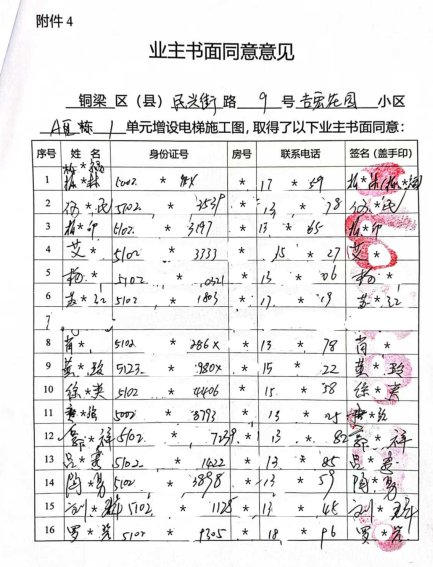近日,铜梁区东城街道民兴街*号(吉宏花园)*区*单元共计24户业主,其中柏*福等19户业主向重庆市铜梁区人民政府东城街道办事处提出申请,增设电梯。现将铜梁区东城街道民兴街*号(吉宏花园)*区*单元增设电梯项目的相关情况公示如下: