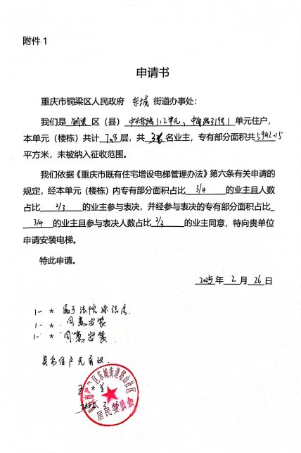 附件:1.书面申请;2.相关合格书;3.增设电梯示意图;4.业主书面同意意见。5.费用分担协议。