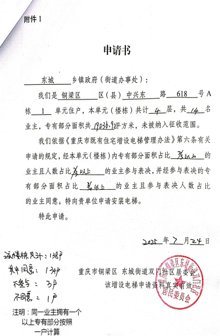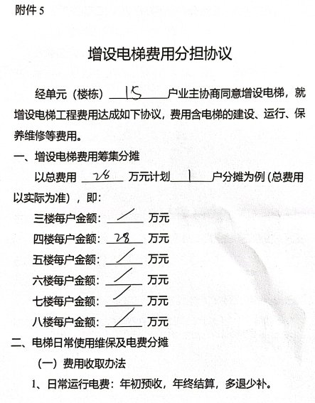 附件:1.书面申请、2.技术审查报告书、3.增设电梯示意图、4.业主书面同意意见、5.费用分担协议。