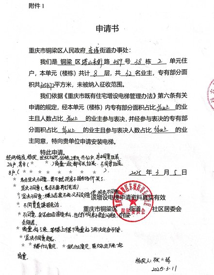 二、公示内容:根据《重庆市既有住宅增设电梯管理办法》规定,现将书面申请、增设电梯示意图等内容向相关业主和利害关系人进行公示,公开征询意见。公示期为7日,2025年8月25日——2025年8月31日。同时在铜梁区政府网同步进行公示,公示链接:https://www.cqstl.gov.cn/。