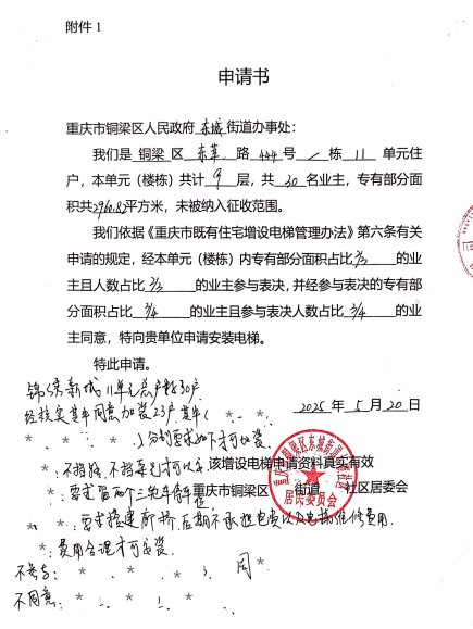 附件:1.书面申请、2.相关合格书、3.增设电梯示意图、4.业主书面同意意见、5.费用分担协议。