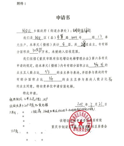 附件:1.书面申请;2.相关合格书;3.增设电梯示意图;4.业主书面同意意见。5.费用分担协议。