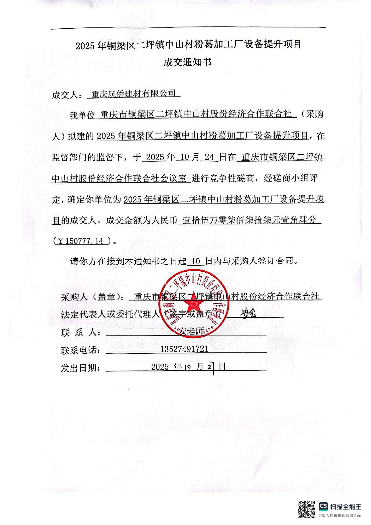 2025年铜梁区二坪镇中山村粉葛加工厂设备提升项目成交通知书