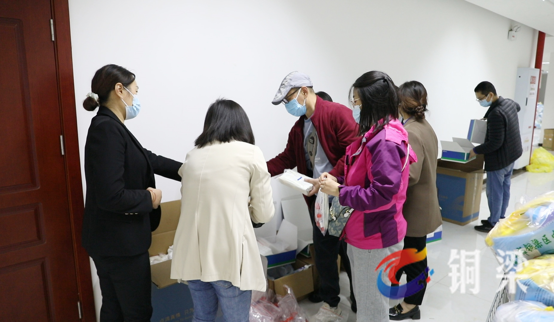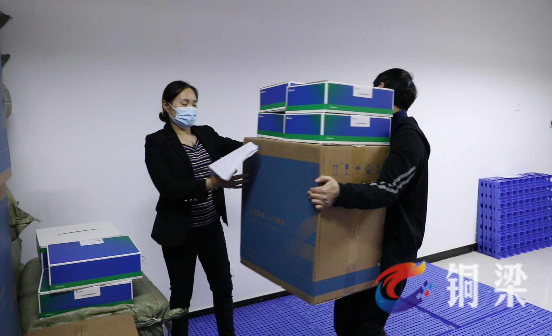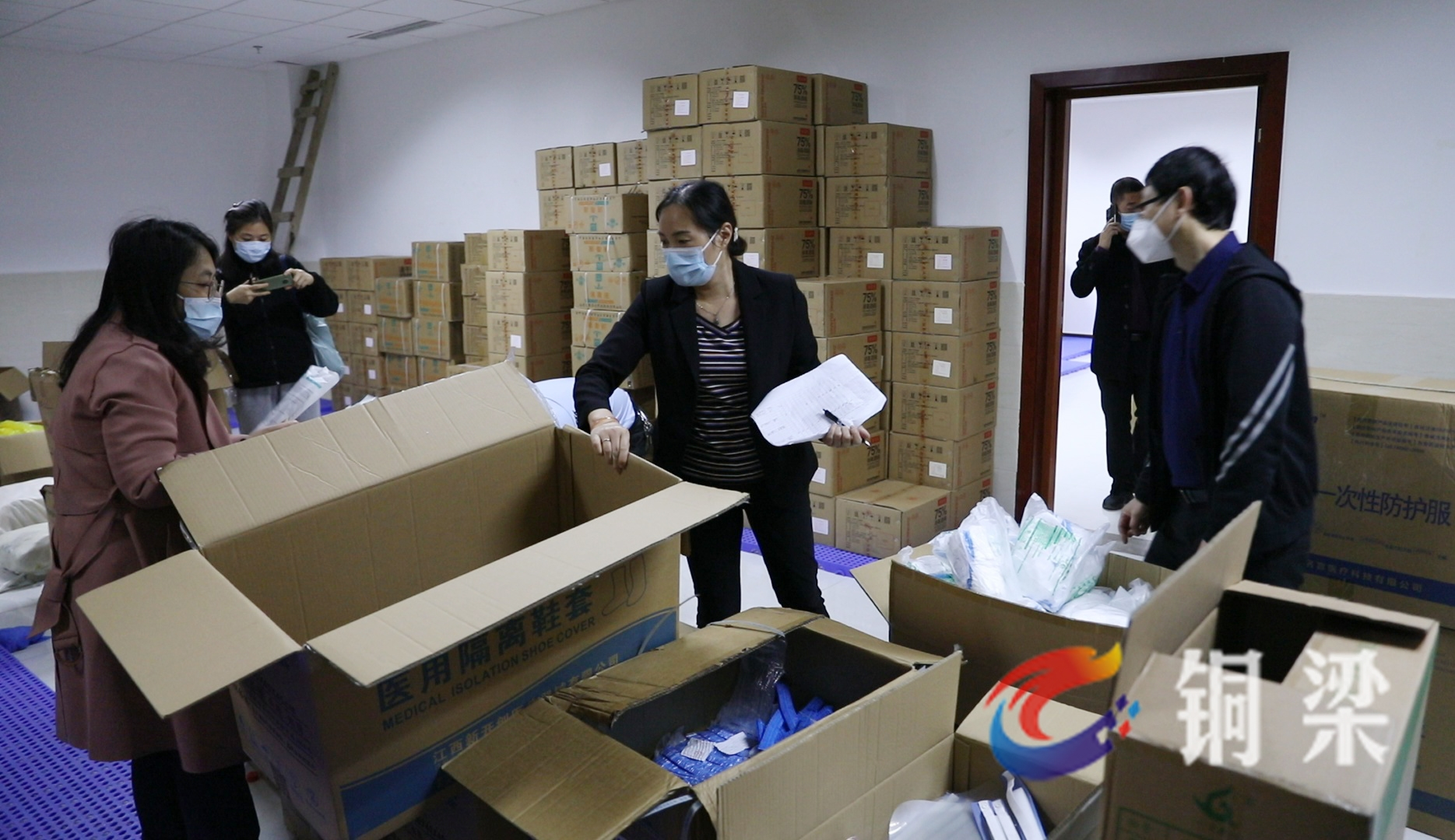 11月8日晚,在位于铜梁区中医院的铜梁区医用防疫物资储备库库房内,几名工作人员正忙着分发防疫物资。