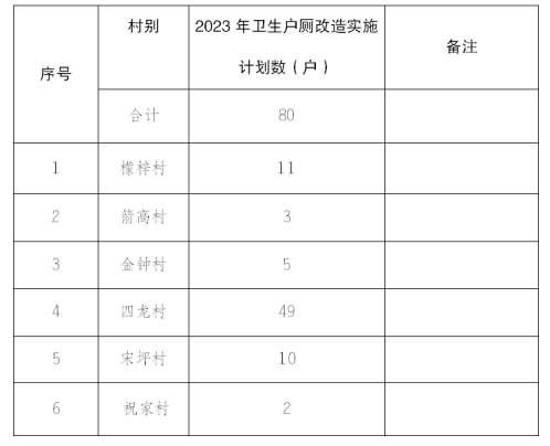 根据《铜梁区2023年农村户厕改造计划表》的安排,我街道2023年计划完成户厕改造80户。结合各村农村户厕调查摸底实际情况为依据,在充分尊重群众意愿的基础上,根据完成任务的难易程度,统筹安排各村2023年改厕计划,具体详见《旧县街道2023年农村户厕改造计划表》(附件1)。