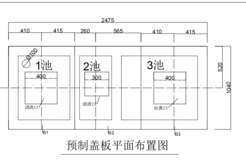 6.盖板安装:三格化粪池要用水泥捣制的盖板密封处理,盖板应留有一、二、三池清渣、清粪口并加盖板密封。第一池、第三池清粪口宽度为40cm,第二池清渣口宽度为30cm,盖板应有锁闭或防坠装置。