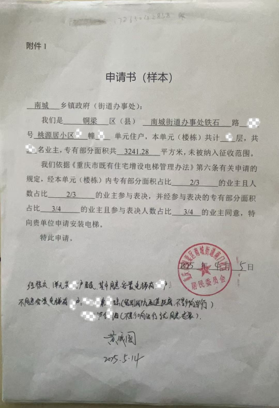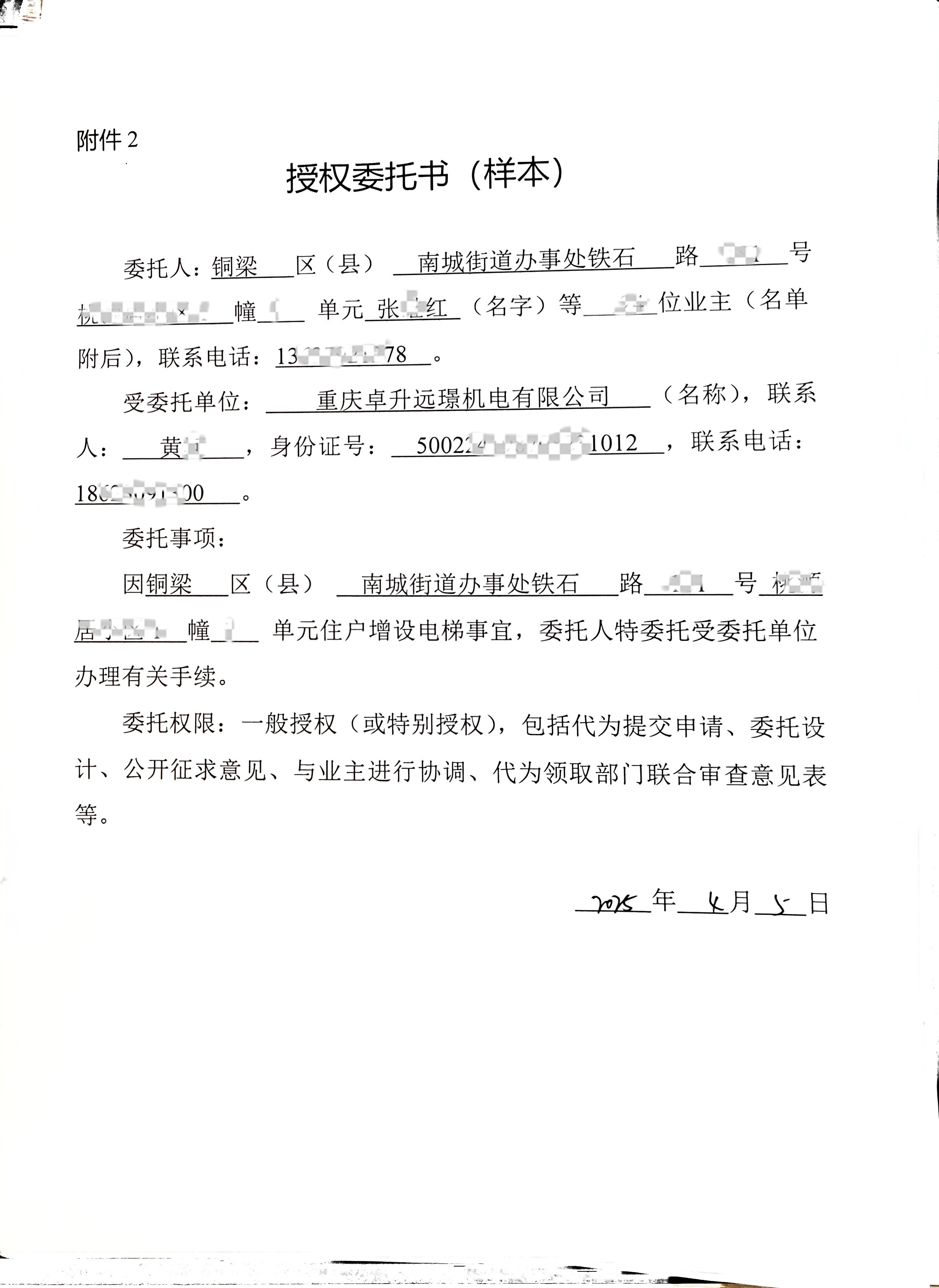附件:1.书面申请;2.授权委托书;3.增设电梯示意图;4.业主书面同意意见;5.增设电梯费用分摊协议。