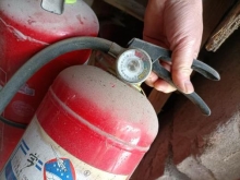 《建筑灭火器配置验收及检查规范》GB50444-2008,干粉灭火器压力表检查,压力表分为红绿黄三个颜色,当指针指示在红色区间时表示灭火器压力不足不可用、指针指示在绿色区间时表示压力正常可用。 |